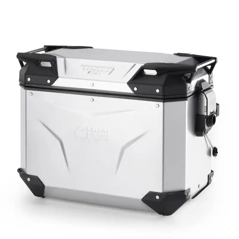 Κατασκευασμένη από φυσικό αλουμίνιο, η πλαϊνή βαλίτσα Trekker Outback EVO SMART διατίθεται σε εκδόσεις για τη δεξιά και την αριστερή πλευρά, οι οποίες μπορούν να αγοραστούν είτε μεμονωμένα είτε ως ζευγάρι.
