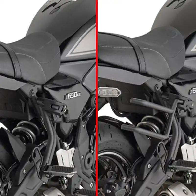 Οι ειδικές βάσεις Givi TR4131 είναι σχεδιασμένες για τους αναβάτες που χρειάζονται τη μεταφορική ικανότητα για τα ταξίδια τους, αλλά θέλουν την “γυμνή” σπορ εμφάνιση της Kawasaki Z650 στις καθημερινές τους βόλτες. Είναι ιδανικές για την υποστήριξη μαλακών πλευρικών σάκων, αποτρέποντας την επαφή τους με τον τροχό ή την εξάτμιση.