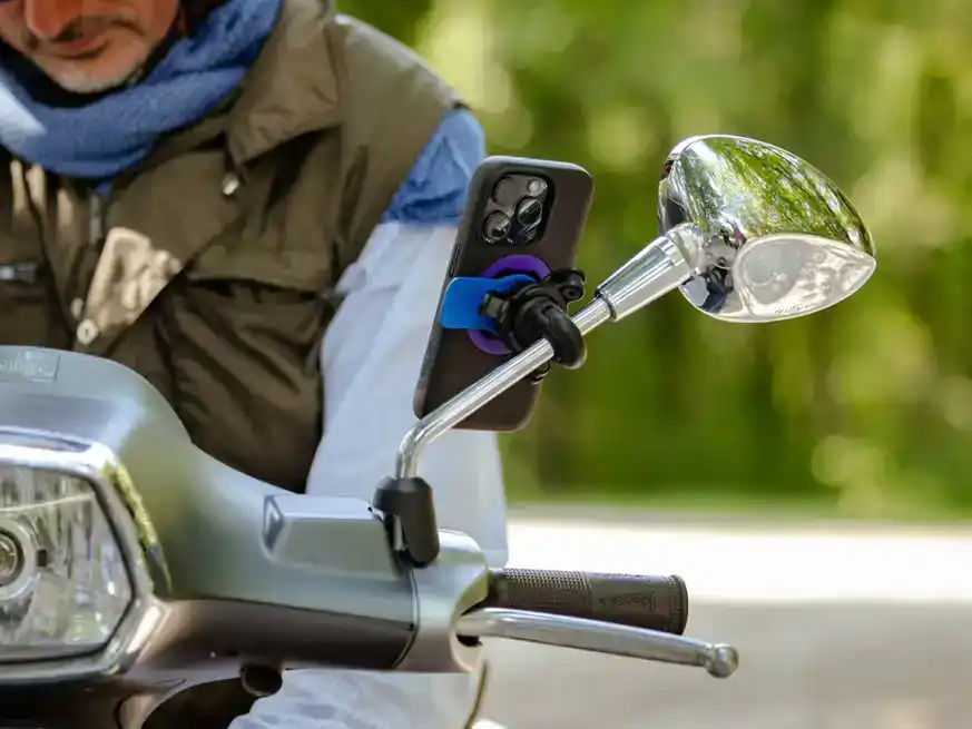 Η βάση στήριξης καθρέφτη Quad Lock® QLM-MIR-2 σάς επιτρέπει να τοποθετείτε με ασφάλεια το τηλέφωνό σας σε τυπικούς καθρέφτες μοτοσικλέτας και σκούτερ και σε μικρές μπάρες.